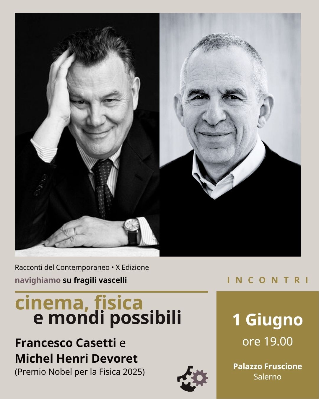 Incontri: lunedì 1 giugno (ore 19.00) Cinema, fisica e mondi possibili Con Francesco Casetti (Sterling Professor of Humanities and Film and Media Studies della Yale University) e Michel Henri Devoret (Professore Emerito di fisica applicata presso Yale University, Premio Nobel per la fisica nel 2025). Introduce Marco Russo (presidente Tempi Moderni). Saluti di Virgilio D’Antonio (magnifico rettore dell’Università degli Studi di Salerno) Un dialogo raro e originale tra due campi solo apparentemente lontani: il cinema, arte della visione e dell’immaginazione, e la fisica, scienza della luce, del tempo e della materia. Se il cinema nasce da principi ottici, meccanici e percettivi,...