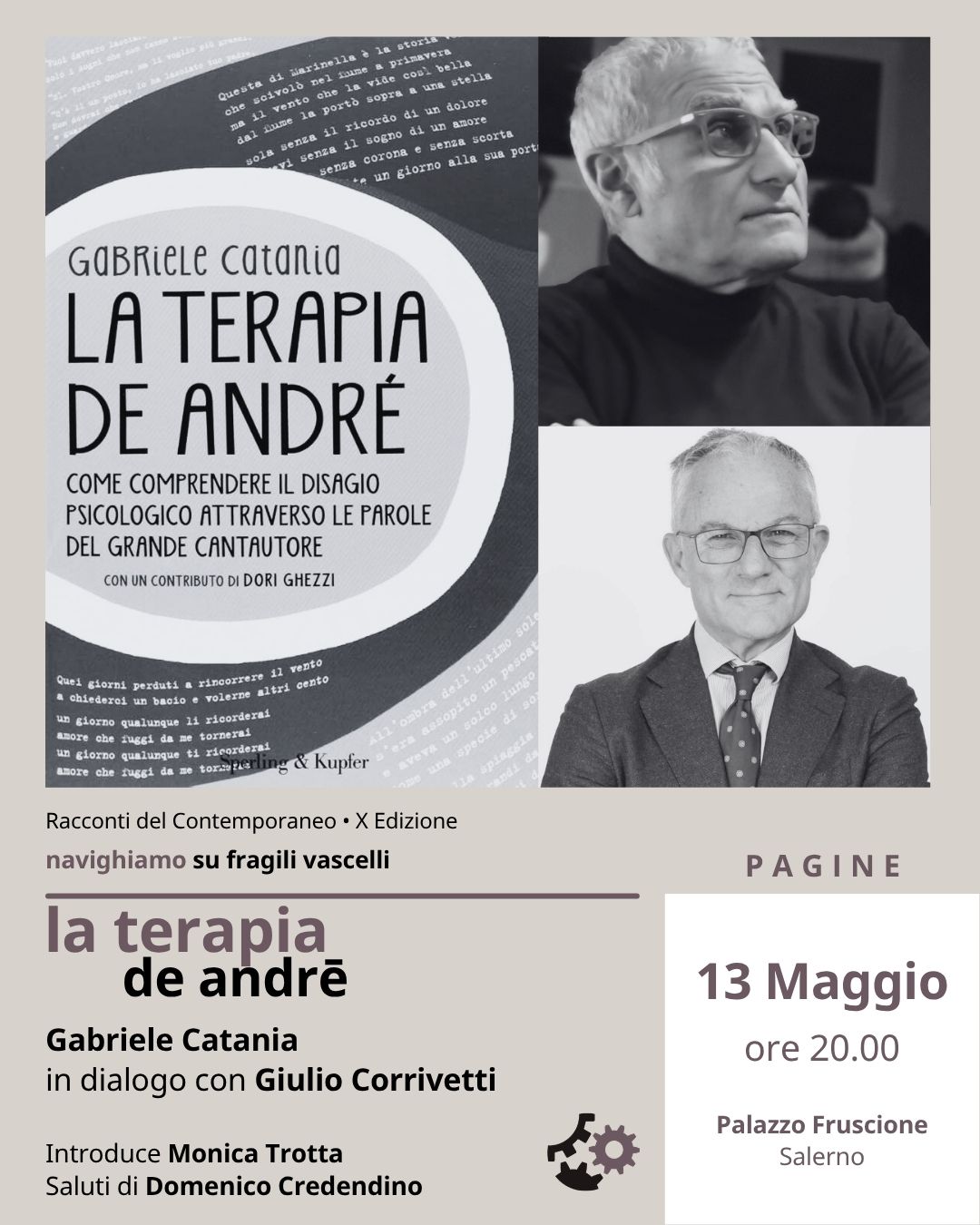 Pagine: mercoledì 13 maggio (ore 20.00) La terapia De André Con Gabriele Catania (Psichiatra e scrittore) in dialogo con Giulio Corrivetti (Psichiatra). Introduce Monica Trotta (giornalista). Saluti di Domenico Credendino (presidente Fondazione Cassa di Risparmio Salernitana) A partire dal volume La terapia De André. Come comprendere il disagio psicologico attraverso le parole del grande cantautore. di Gabriele Catania, Sperling & Kupfer, 2013. Osservando che le storie di alcuni suoi pazienti presentavano analogie e parallelismi con quelle dei personaggi raccontati dal cantautore genovese, Catania ha notato che l’identificazione in questi personaggi poteva avere un utile effetto di distanziamento e individuazione di parti disfunzionali di...