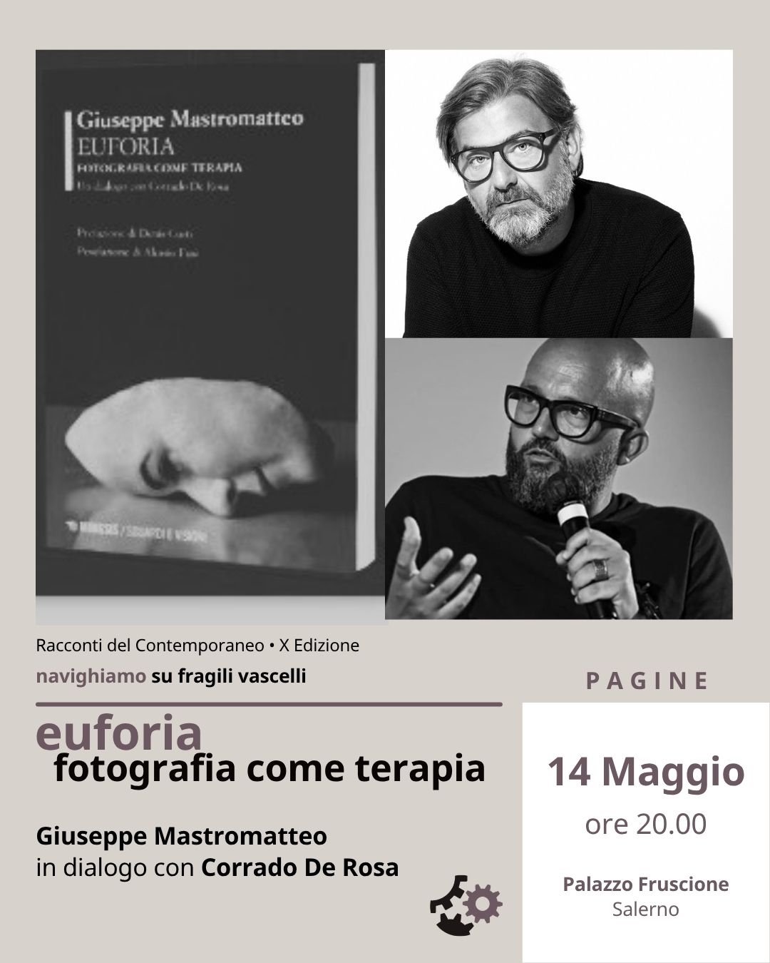 Pagine: giovedì 14 maggio (ore 20.00) Euforia Con Giuseppe Mastromatteo (fotografo e scrittore) in dialogo con Corrado de Rosa (psichiatra e scrittore) A partire dal volume Euforia. Fotografia come terapia, di Giuseppe Mastromatteo, Mimesis, 2026. Euforia è un progetto fotografico di Giuseppe Mastromatteo che indaga il rapporto tra immagine, memoria e trauma, trasformando la fotografia in uno strumento di conoscenza interiore. Attraverso maschere, ricostruzioni visive e frammenti autobiografici, l’artista attraversa il confine tra identità, dolore e rappresentazione. Da questo lavoro nasce anche un libro-intervista: un dialogo tra Mastromatteo e lo psichiatra e scrittore Corrado De Rosa, in cui arte e psicologia si incontrano...
