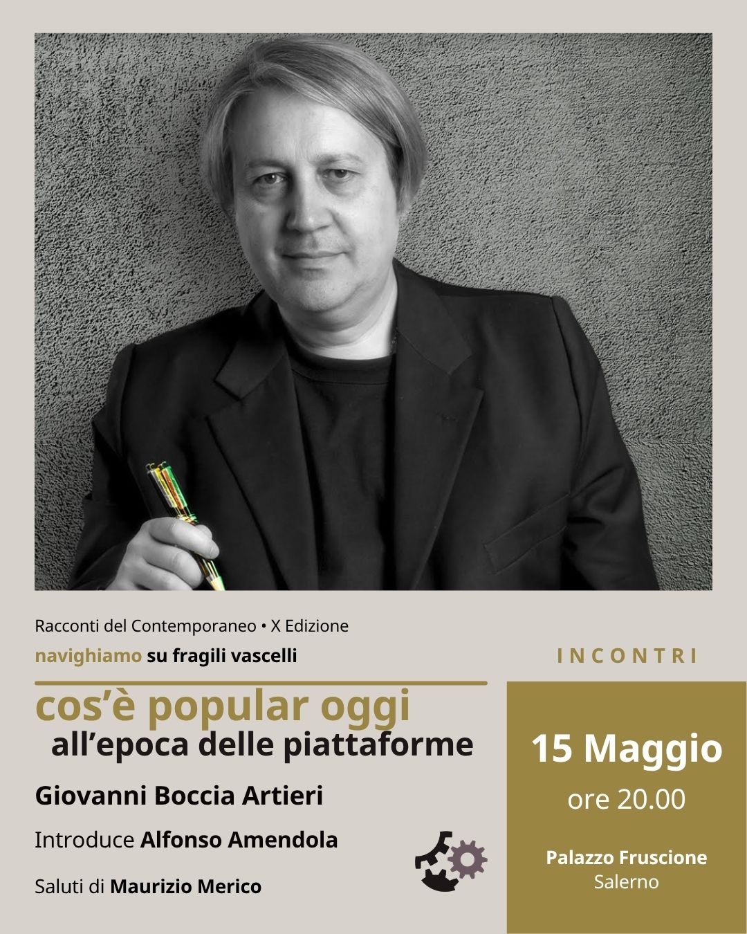 Incontri: venerdì 15 maggio (ore 20.00) Cos’è popular oggi all’epoca delle piattaforme Con Giovanni Boccia Artieri (docente di Sociologia della comunicazione e dei media digitali, Università di Urbino Carlo Bo). Introduce Alfonso Amendola (direttore scientifico Tempi Moderni). Saluti di Maurizio Merico (direttore Dipartimento Studi Politici e Sociali, Università degli Studi di Salerno) Questa lectio propone una riflessione sociologica sul significato del “popolare” nell’attuale ecosistema delle piattaforme digitali. Se nella modernità il popular rimandava a pratiche culturali collettive e a forme relativamente condivise di consumo e riconoscimento, oggi esso si ridefinisce entro ambienti governati da algoritmi, metriche di visibilità e...