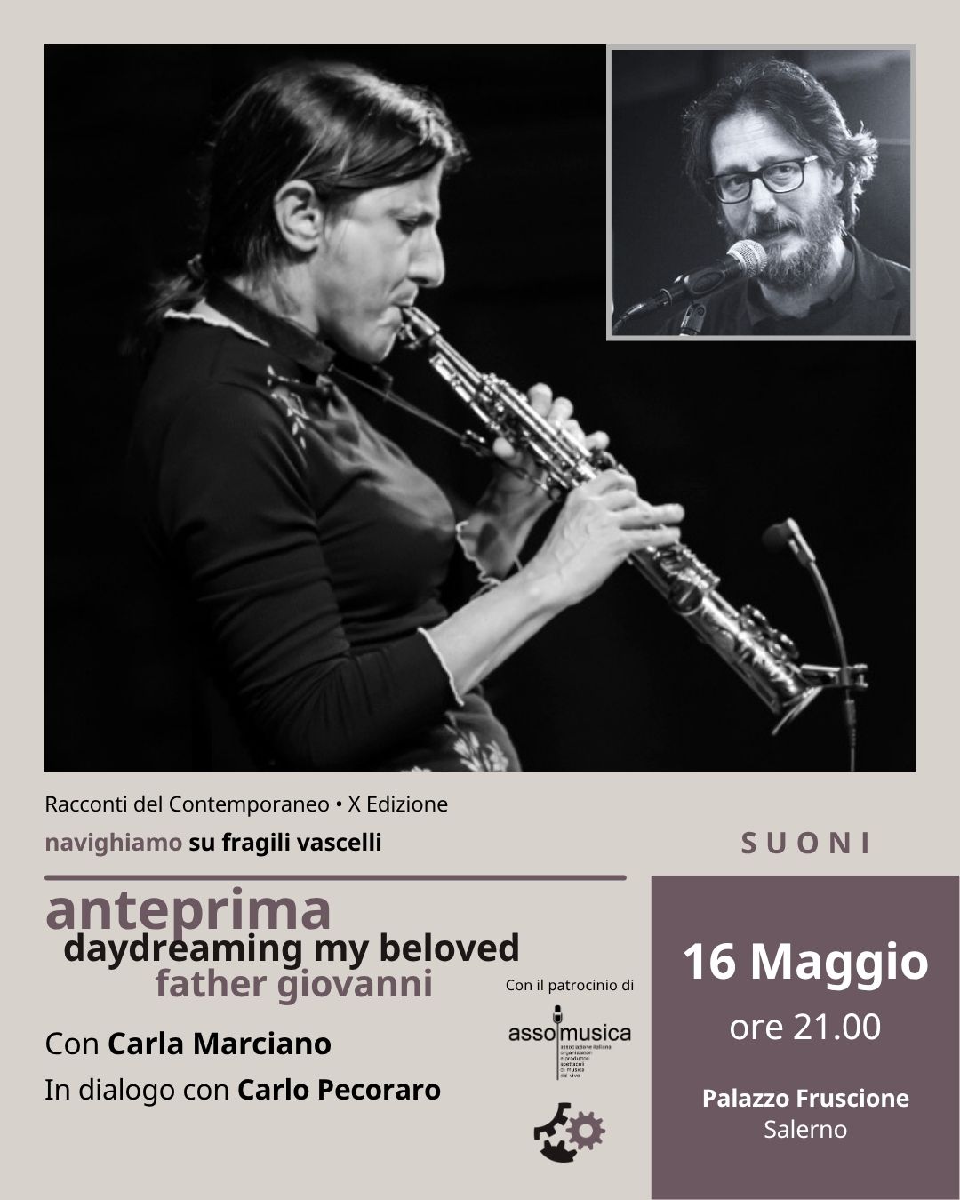 Suoni: sabato 16 maggio (ore 21.00) Carla Marciano. Anteprima con il patrocinio di Assomusica Con Carla Marciano (compositrice, musicista) in dialogo con Carlo Pecoraro (giornalista) Daydreaming My Beloved Father Giovanni, preascolto con Carla Marciano Preascolto del nuovo disco – in uscita per la prestigiosa etichetta olandese Challenge Records - della sassofonista e compositrice Carla Marciano dal titolo: “Daydreaming my beloved father Giovanni”. Il lavoro nasce dal legame profondo tra il padre Giovanni e la figlia Carla. Un amore reciproco che “sognando ad occhi aperti” si è trasformato in musica. “È stato mio padre il mio vero insegnante di musica. È lui che mi...