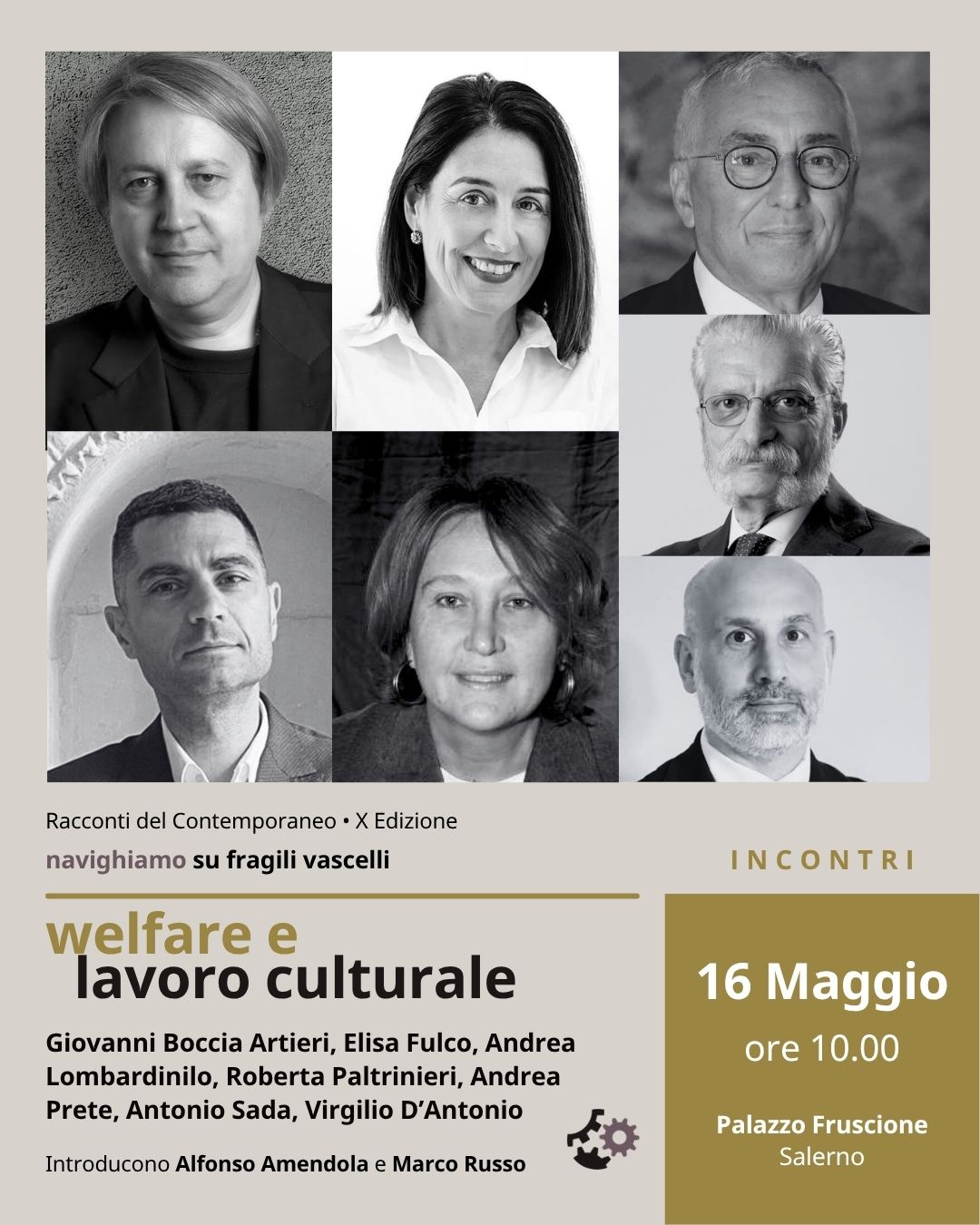 Incontri: sabato 16 maggio (ore 10.00) Welfare e lavoro culturale Con Giovanni Boccia Artieri (Università di Urbino Carlo Bo e presidente Santarcangelo dei Teatri), Virgilio D’Antonio (magnifico rettore dell’Università degli Studi di Salerno), Elisa Fulco (storica dell’arte, curatrice e saggista), Andrea Lombardinilo (Università Roma Tre e presidente della Fondazione Quadriennale di Roma), Roberta Paltrinieri (docente di sociologia dei processi culturali e comunicativi, Alma Mater Studiorum, Università di Bologna), Andrea Prete (presidente di Unioncamere e Camera di Commercio di Salerno), Antonio Sada (presidente Confindustria Salerno). Introducono Alfonso Amendola (direttore scientifico Tempi Moderni) e Marco Russo (presidente Tempi Moderni) L’incontro propone una...