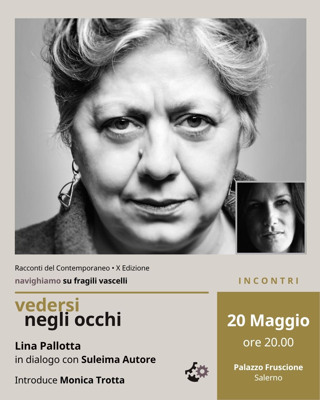 Incontri: mercoledì 20 maggio (ore 20.00) Vedersi negli occhi Con Lina Pallotta (fotografa) in dialogo con Suleima Autore (curatrice). Introduce Monica Trotta (giornalista) Lina Pallotta, fotografa e docente tra Roma e New York, ha rivolto il suo sguardo alle esistenze marginali, alle identità in trasformazione, alle verità più fragili e meno visibili. Formata all’International Center of Photography, ha fatto della fotografia un luogo di ascolto, di prossimità e di attraversamento umano. Nei suoi lavori, intensi e profondamente liberi, l’immagine si fa racconto, testimonianza, vibrazione del vissuto. Tra tensione poetica e impegno civile, il suo occhio ha saputo restituire corpi, amori, lotte...