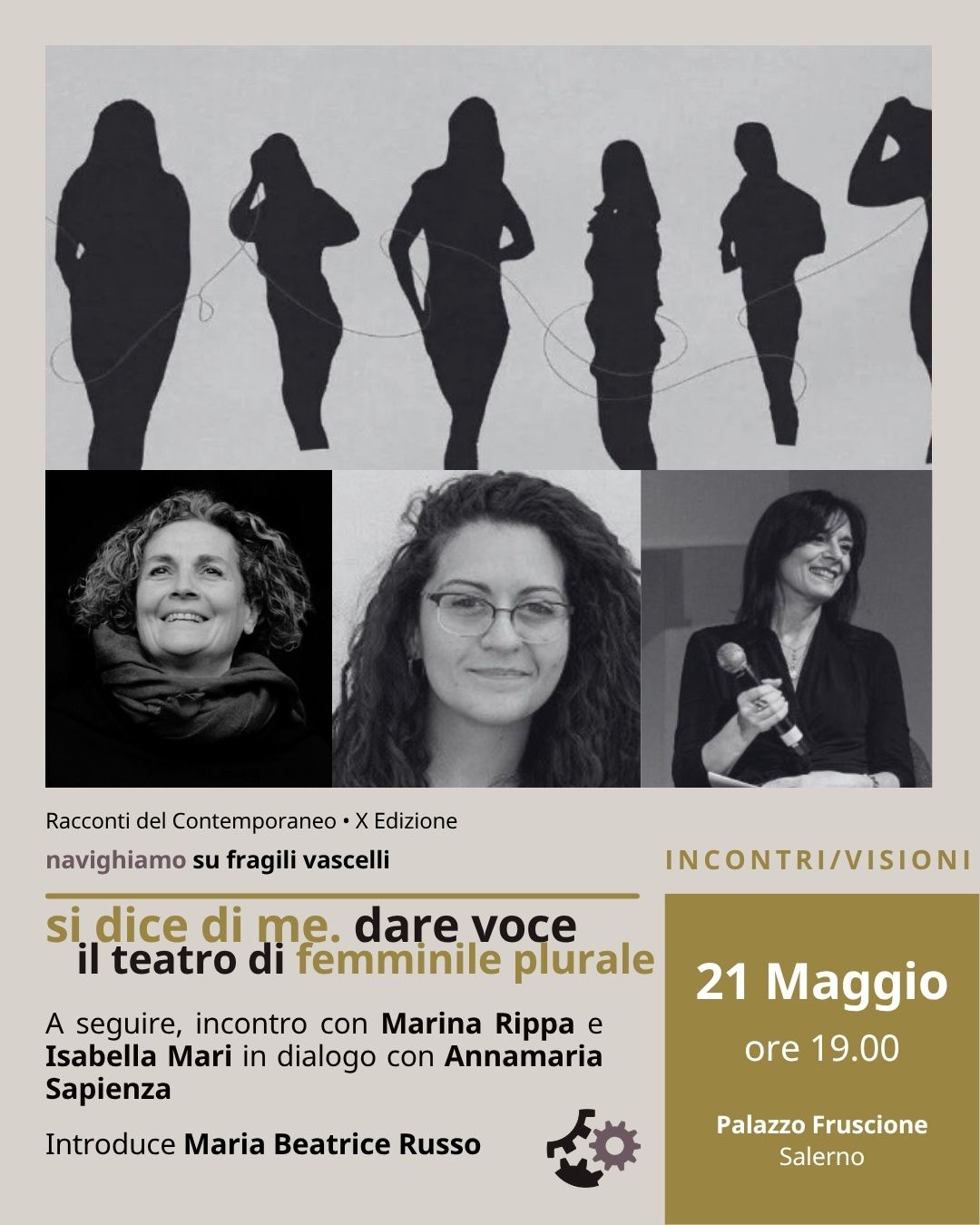 Incontri|Visioni: giovedì 21 maggio (ore 19.00) Si dice di me. Dare voce. Il teatro di f.pl. femminile plurale Anno 2024- Durata: 68 minuti – Genere: Documentario - Produzione: Italia- Regia: Isabella Mari Da circa vent’anni Marina Rippa si dedica a un gruppo di donne del quartiere Forcella di Napoli conducendo laboratori teatrali che trasformano la scena in spazi di condivisione e liberazione alla ricerca di una bellezza desueta che diventa forza interiore. Il docufilm, diretto da Isabella Mari, racconta questo viaggio di emancipazione e autodeterminazione in cui il teatro diventa dimensione irrinunciabile, sacra e vitale oltre ogni convenzione. A seguire incontro con Marina...