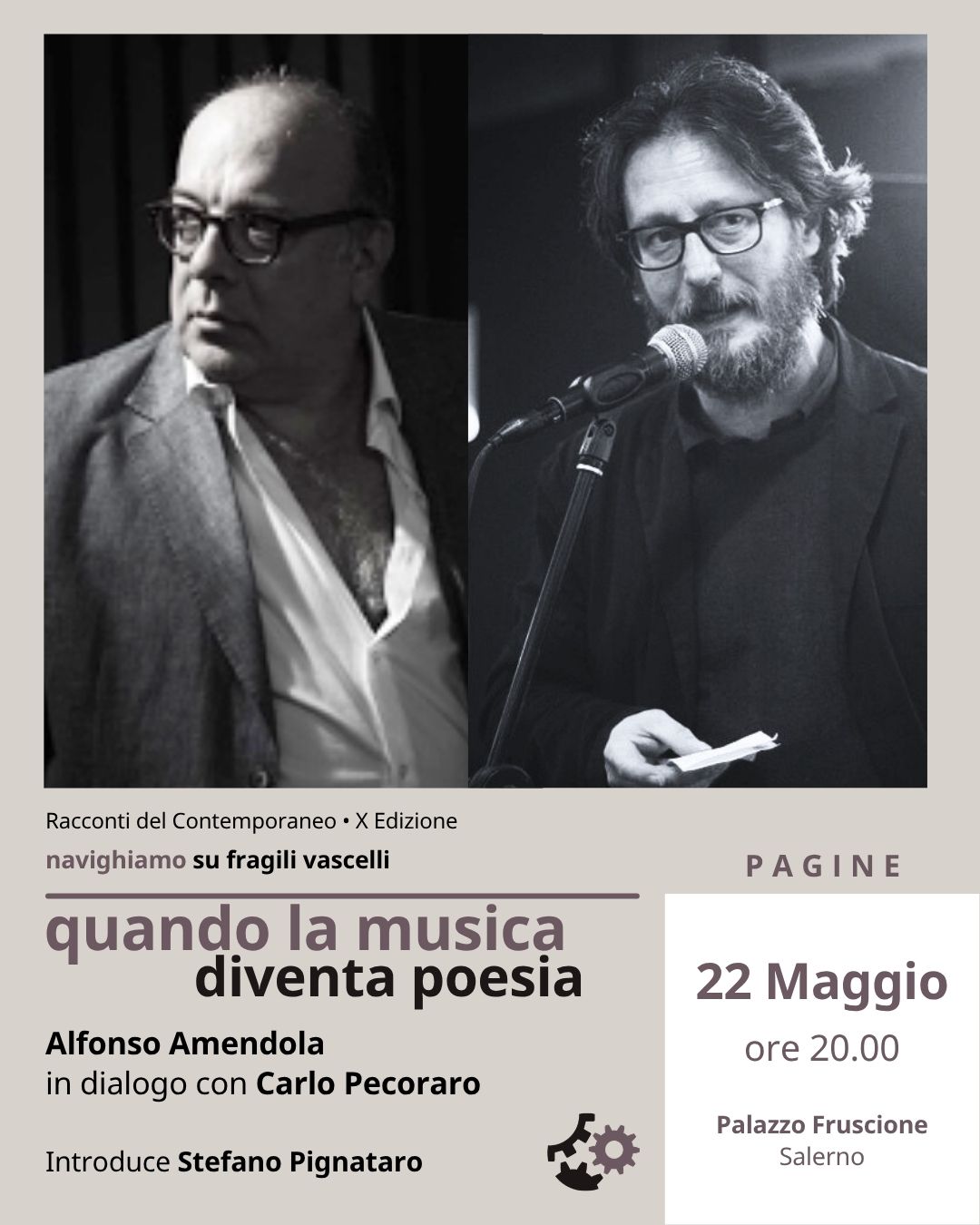 Pagine: venerdì 22 maggio (ore 20.00) Quando la musica diventa poesia Con Alfonso Amendola (docente di Sociologia dei processi culturali, Università degli Studi di Salerno) in dialogo con Carlo Pecoraro (giornalista) A partire dal volume Giocarsi il cielo a dadi. 12 tracce per Roberto Vecchioni, Francesco D’Amato Editore, Salerno, 2026. Un viaggio corale nell’universo poetico di Roberto Vecchioni, tra musica, letteratura, insegnamento e immaginario collettivo. Cantore della bellezza e delle inquietudini del nostro tempo, Vecchioni emerge in queste pagine come artista poliedrico e intellettuale pubblico, capace di intrecciare poesia, mito, quotidianità e riflessione civile. Ne nasce il ritratto vivo e vibrante di una...