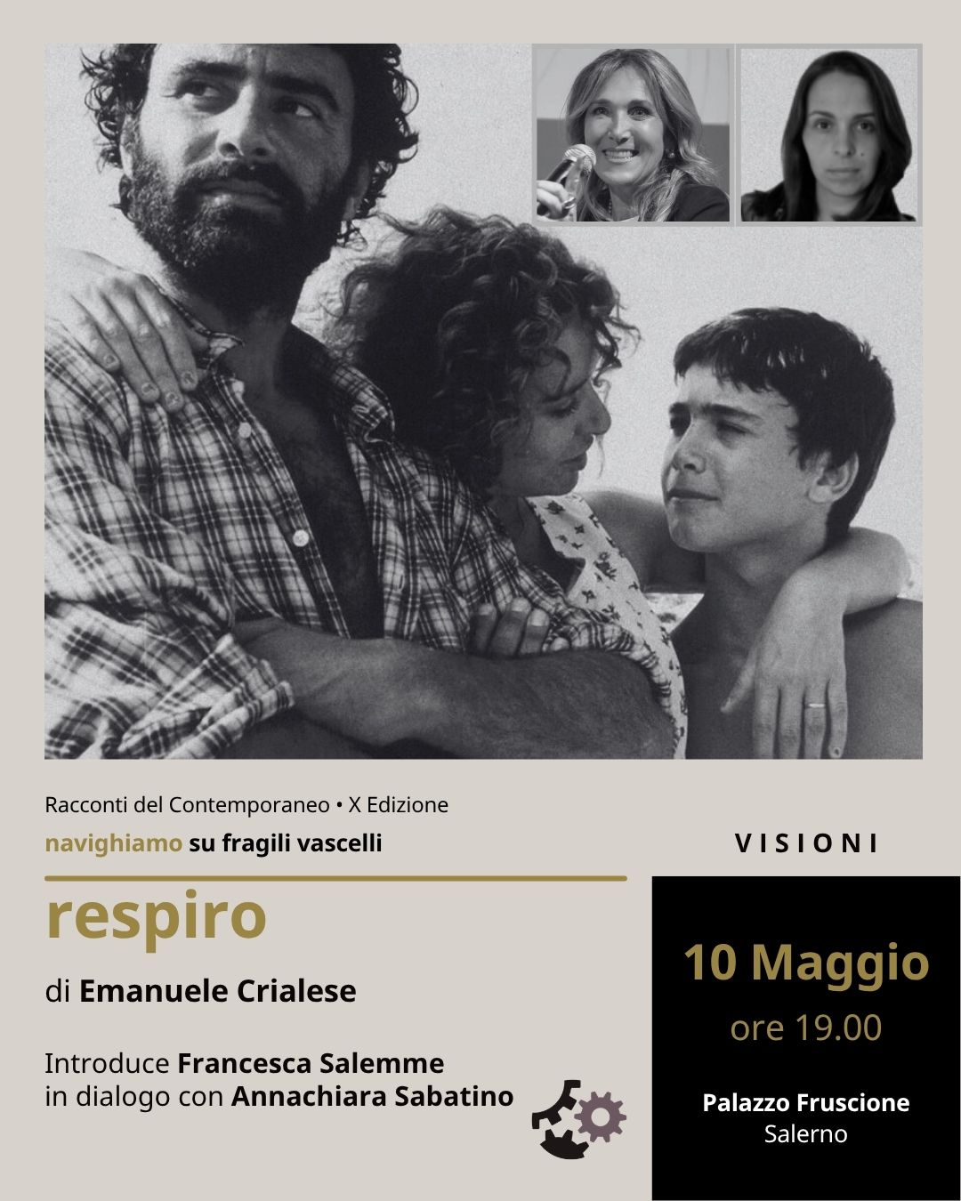 Visioni: domenica 10 maggio (ore 19.00) Respiro Introduce Francesca Salemme in dialogo con Anna Chiara Sabatino (docente Linguaggi audiovisivi e Storytelling digitale, Università degli Studi di Salerno) Anno 2002 - Durata: 100 minuti (1h38’) – Genere: Drammatico - Produzione: Italia - Regia: Emanuele Crialese – Interpreti: con Valeria Golino, Vincenzo Amato, Francesco Casisa, Veronica D’Agostino, Elio Germano. Sull’isola di Lampedusa, in una realtà sospesa tra la terra e il mare, Grazia non è come le altre isolane. Le donne più anziane la definiscono “o troppo felice o troppo triste”, perché non sanno dare un nome a quella forma di depressione che l’attanaglia, rendendo il...