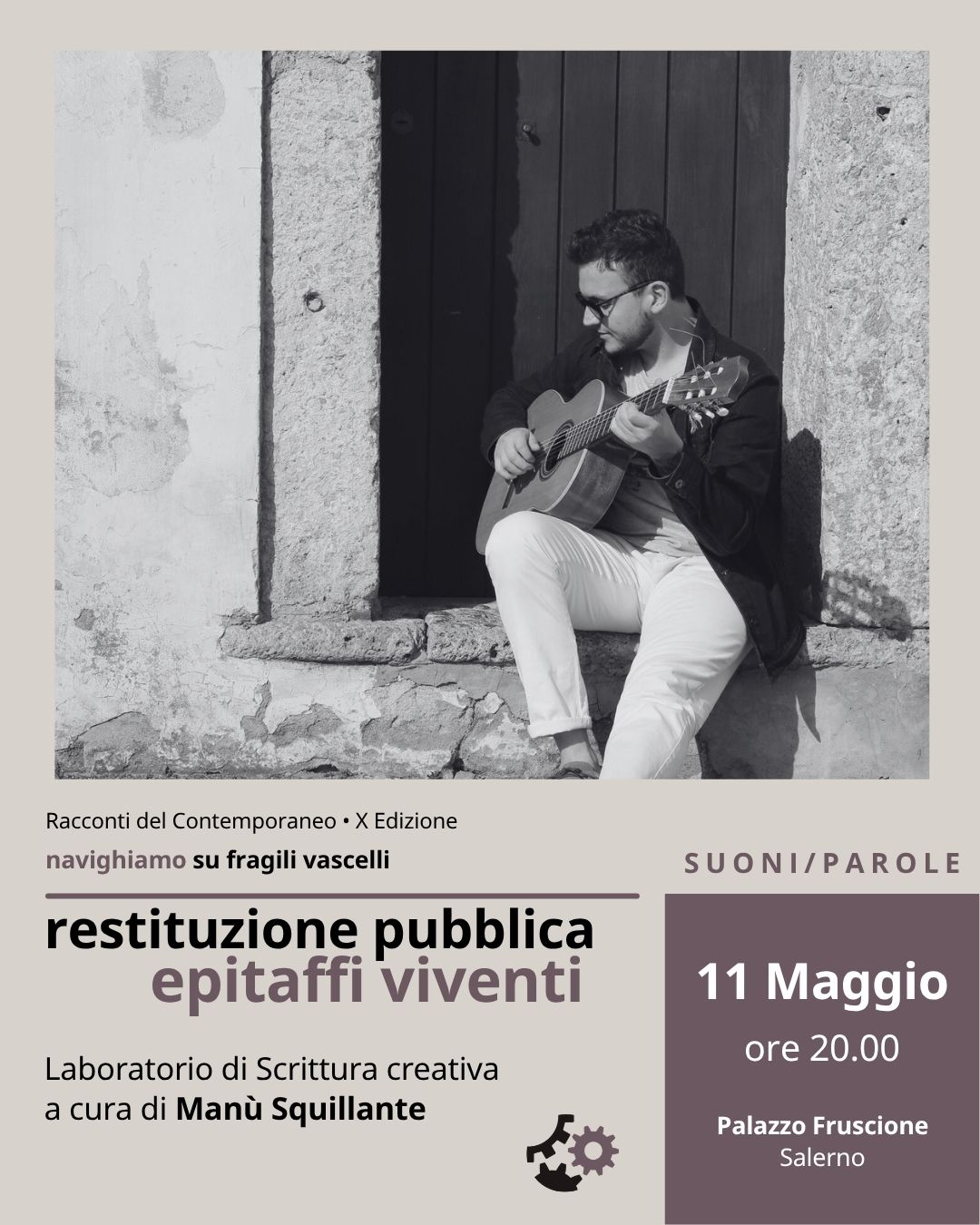 Laboratori: lunedì 11 maggio (ore 20.00) Restituzione pubblica. Epitaffi Viventi Laboratorio di Scrittura creativa a cura di Manù Squillante (cantautore e scrittore) L’ultimo incontro è concepito come momento conclusivo e di restituzione del percorso svolto. I partecipanti daranno voce agli epitaffi viventi nati durante il laboratorio attraverso una lettura performativa collettiva. La restituzione non sarà uno spettacolo teatrale tradizionale, ma un atto poetico condiviso, in cui le voci dei partecipanti si intrecciano per restituire alla comunità un racconto corale fatto di memoria, fragilità e umanità....