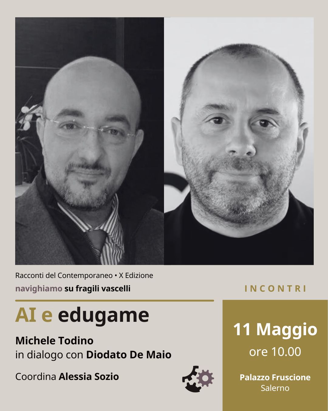 Incontri: lunedì 11 maggio (ore 10.00) AI e Edugame Con Michele Todino (ricercatore di Didattica speciale e Tecnologie didattiche, Università di Salerno) in dialogo con Diodato De Maio (presidente Fondazione De Chiara De Maio). Coordina Alessia Sozio (PhD, UniPegaso) L’intelligenza artificiale applicata agli edugame rende l’apprendimento più personalizzato, adattando contenuti, livelli di difficoltà e feedback in base ai bisogni del singolo studente. In questo incontro, il gioco educativo diventa uno spazio interattivo e dinamico per analizzare temi dell’arte....