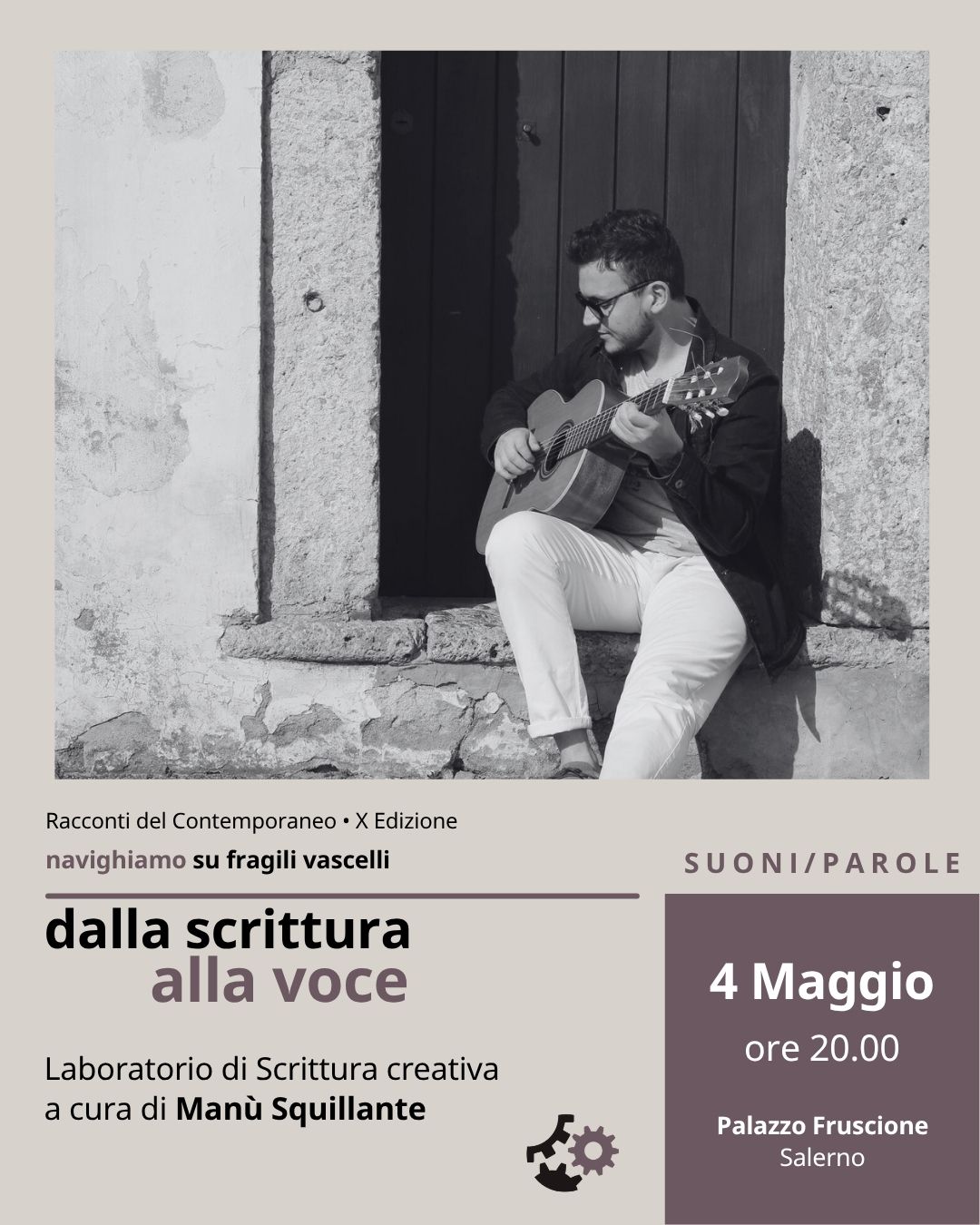 Laboratori: lunedì 4 maggio (ore 20.00) Dalla scrittura alla voce Laboratorio di Scrittura creativa a cura di Manù Squillante (cantautore e scrittore) Il terzo incontro prosegue il lavoro creativo continuando sviluppare e rielaborare gli epitaffi viventi nati durante il laboratorio, approfondendo la scrittura e iniziando a trasformare i testi in parola viva....