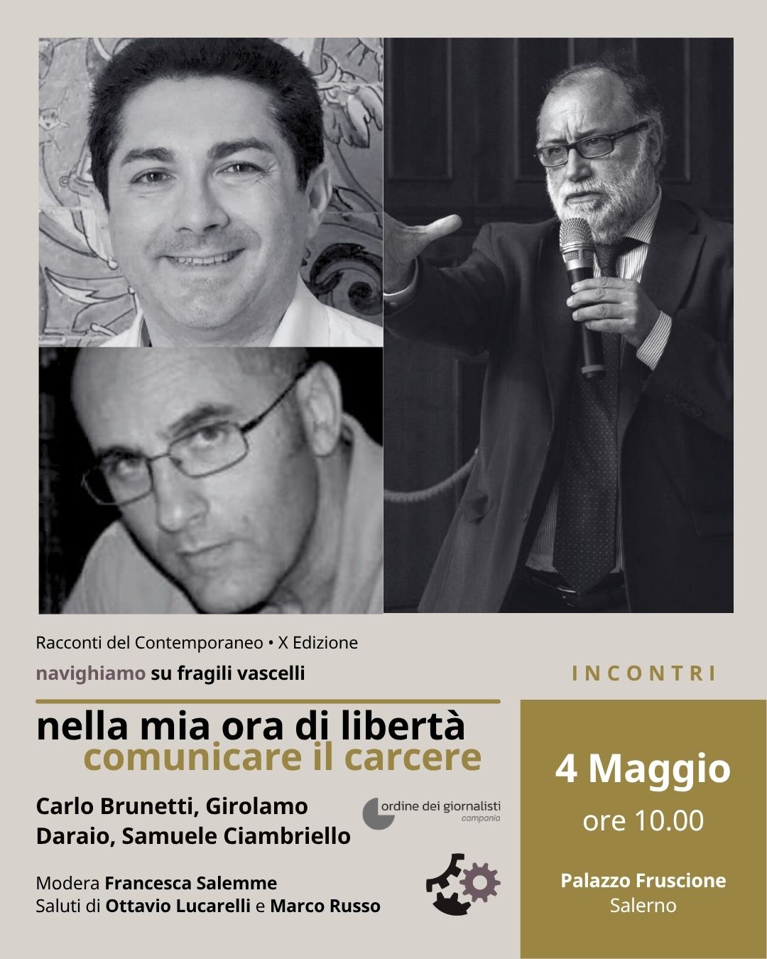 Incontri: lunedì 4 maggio (ore 10.00-14.00) “Nella mia ora di libertà – Comunicare il carcere” Corso di formazione OdG Campania (in collaborazione con OdG Campania) Relatori: Carlo Brunetti (direttore Casa circondariale “A. Caputo” Salerno), Girolamo Daraio (docente di diritto penitenziario, Università degli Studi di Salerno), Samuele Ciambriello (garante dei diritti dei detenuti Regione Campania). Modera Francesca Salemme (giornalista). Saluti di Ottavio Lucarelli (presidente OdG Campania) e Marco Russo (presidente Tempi Moderni) Un ragionamento su come viene raccontato il carcere dalla stampa, cosa sarebbe possibile correggere, cambiare, diversificare… per evitare stereotipi e narrazioni sbagliate. ...