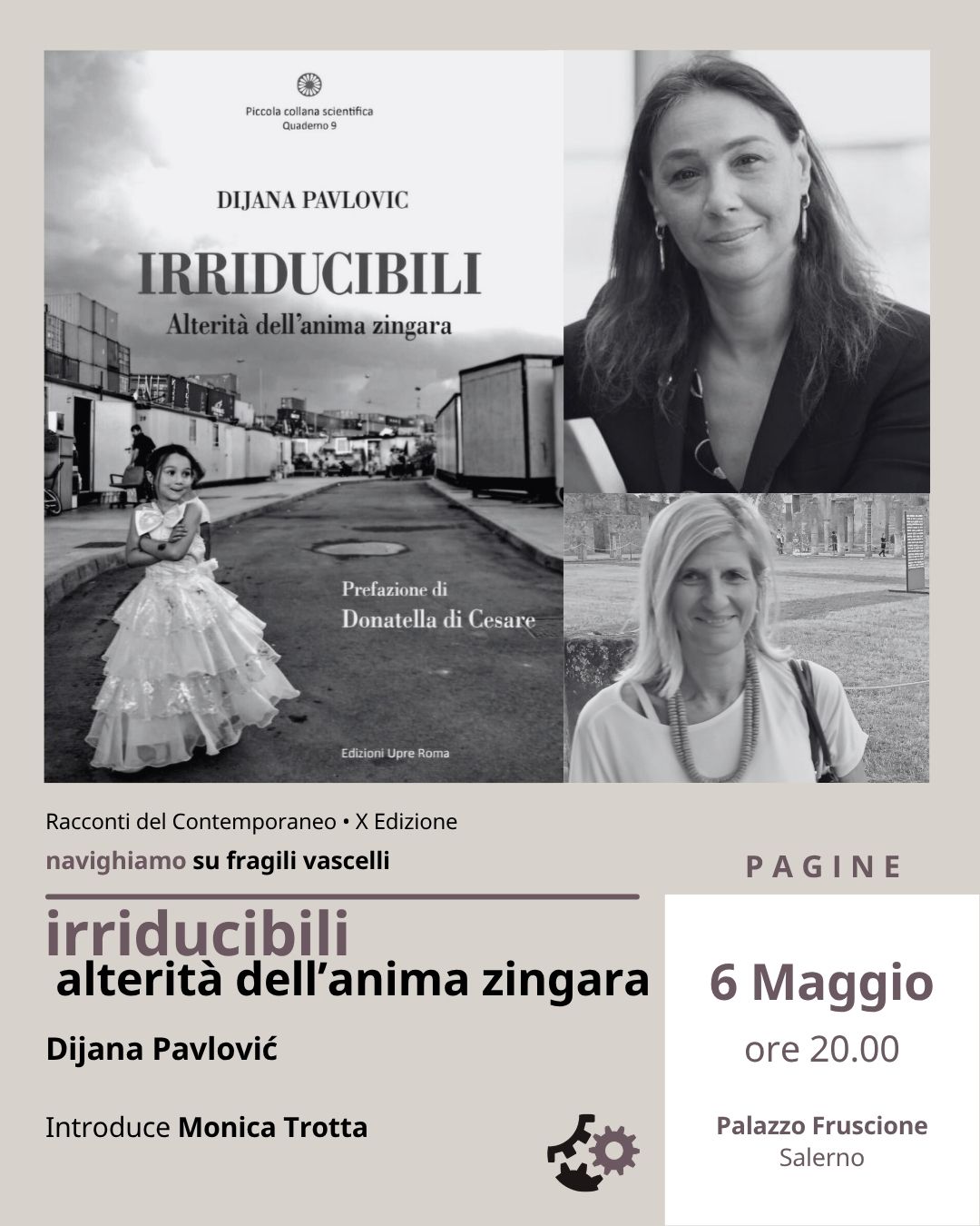 Pagine: mercoledì 6 maggio (ore 20.00) Irriducibili. Alterità dell’anima zingara Con Djana Pavlovic (giornalista e scrittrice). Introduce Monica Trotta (giornalista) A partire dal volume Irriducibili. Alterità dell’anima zingara, di Djana Pavlovic, Edizioni Upre Roma, 2025. Irriducibile: così vive l’anima zingara, nell’alterità, nella ferita, nella dignità che resiste. Nata in Serbia in una famiglia Rom, Djana Pavlovic ha conosciuto fin da bambina il peso del pregiudizio e ha trasformato quell’esperienza in coscienza, voce pubblica, lotta per i diritti. Attrice, attivista e protagonista dell’impegno culturale e politico romanì in Europa, ha fatto della propria storia una battaglia contro ogni discriminazione....