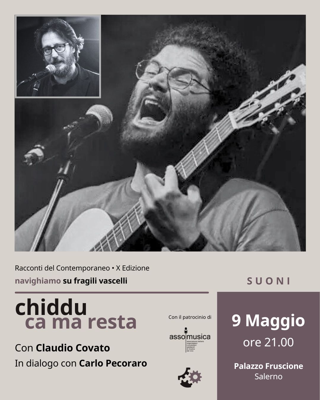 Suoni: sabato 9 maggio (ore 21.00) Chiddu ca ma resta con il patrocinio di Assomusica Con Claudio Covato (autore, musicista) in dialogo con Carlo Pecoraro (giornalista) Claudio Covato, cantautore siciliano e vincitore del Premio Fabrizio De André 2025, ci racconta il suo percorso artistico, fatto di studi musicali e ricerca poetica. Claudio canta il dialetto della sua Rosolini (SR), un siciliano autentico che porta altrove. ...