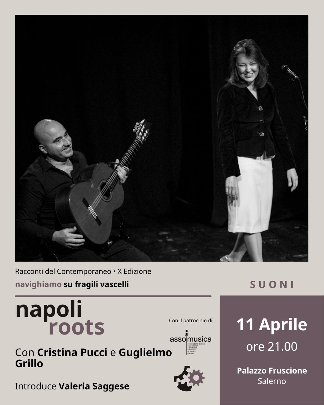 Suoni: sabato 11 aprile (ore 21.00) Napoli Roots con il patrocinio di Assomusica Con Cristina Pucci (voce), Guglielmo Grillo (chitarra classica). Introduce Valeria Saggese (giornalista) Il duo Napoli Roots propone un viaggio introspettivo che muove dalle radici della musica partenopea e, in equilibrio tra il rigore che la tradizione impone e l’amore per la musica classica, jazz ed etnica, approda a un sound ricercato e ricco di sfumature, libero da pregiudizi stilistici, in grado di esprimere emozioni anche attraverso i silenzi. Una sorta di racconto onirico in cui la tradizione catalana si mescola con la lirica drammatica e gioiosa di Salvatore Di Giacomo;...