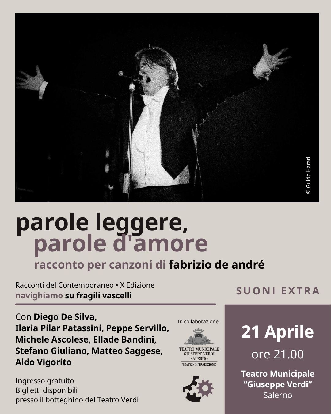Suoni|Extra: martedì 21 aprile 2026 (ore 21.00) Teatro municipale “G. Verdi” Parole leggere, parole d'amore Racconto per canzoni di Fabrizio De André con: Diego de Silva, voce e chitarra; Ilaria Pilar Patassini, voce; Peppe Servillo, voce; Michele Ascolese, chitarra; Ellade Bandini, batteria; Stefano Giuliano, sassofono; Matteo Saggese, pianoforte; Aldo Vigorito, contrabasso. Servillo e la Patassini, non hanno bisogno di presentazioni, già nel 2021 si resero protagonisti di uno straordinario omaggio al cantautore genovese, con un accurato lavoro di rilettura mutuato dagli arrangiamenti che il compositore Geoff Westley fece nel 2011 con la London Symphony Orchestra. Ma i due hanno reso omaggio...